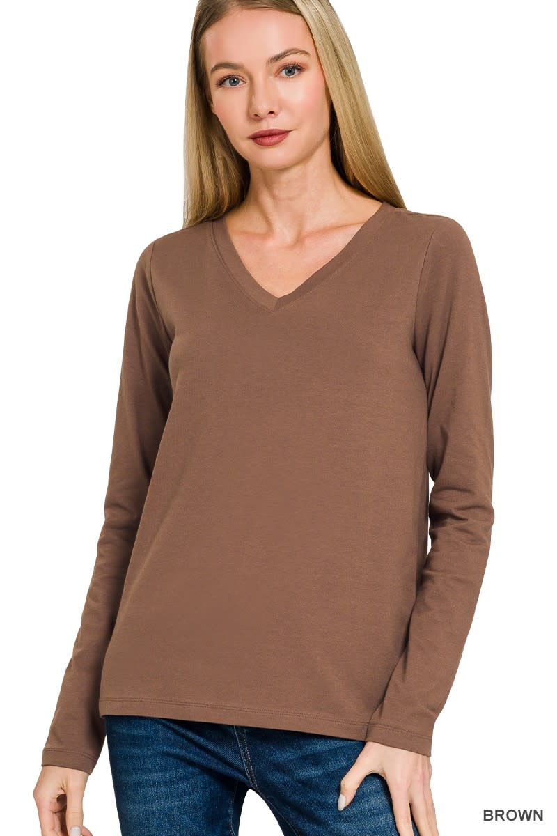 COTTON LONG SLEEVE V-NECK - CHOCOLATE