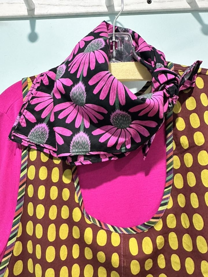 KATE HAS BECOME SLIGHTLY OBSESSED WITH SMALL SQUARE SCARVES/NECKERCHIEFS/BANDANAS!! BEING OF AN AGE WHERE DRAFTS ARE ANNOYING AND A LITTLE COVERAGE IS DESIRED, BUT ALSO AT ANY GIVEN MOMENT A RAGING FIRESTORM OF HEAT CAN OVERWHELM, A LITTLE COTTON SQUARE, TIED AT THE NECK IS THE PERFECT SOLUTION.