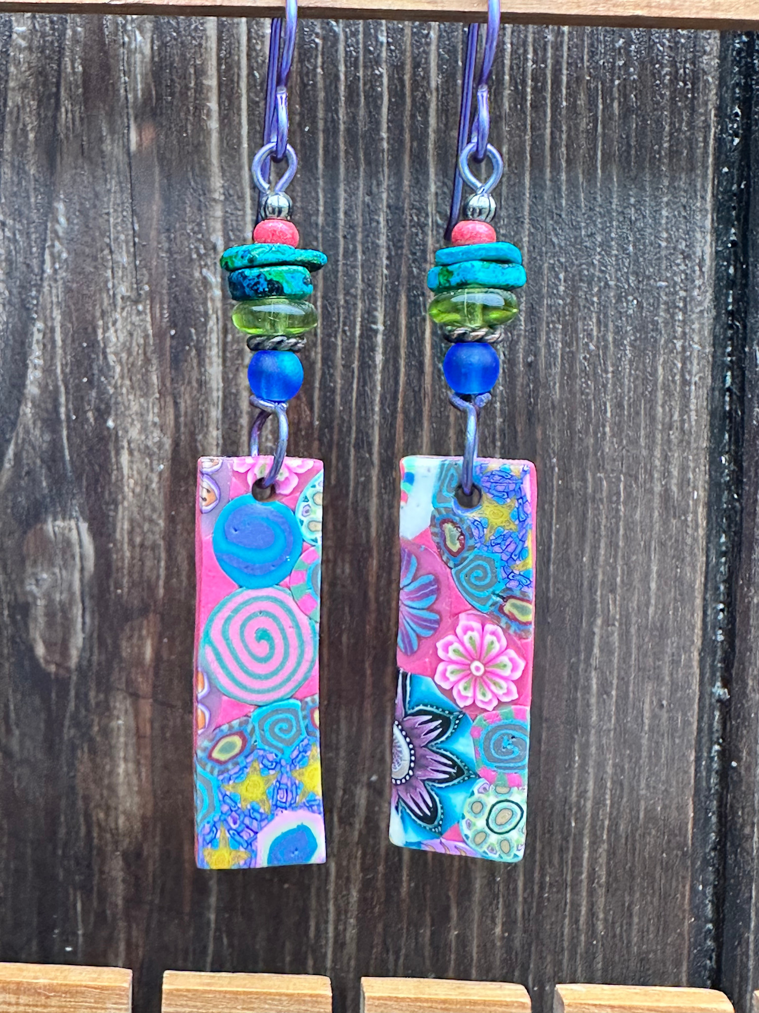 For the last 30 years, Kate's one of kind earrings, made from intricate polymer clay canes have been her best seller. These earrings will start conversations in grocery stores.  not kidding!