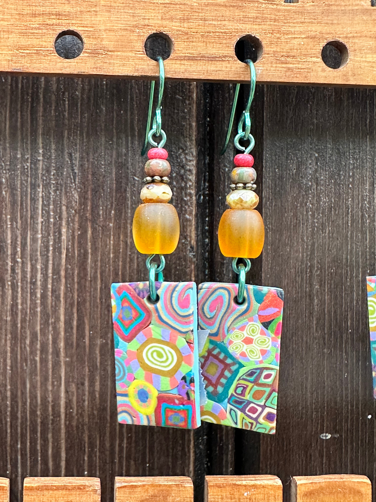 For the last 30 years, Kate's one of kind earrings, made from intricate polymer clay canes have been her best seller. These earrings will start conversations in grocery stores.  not kidding!