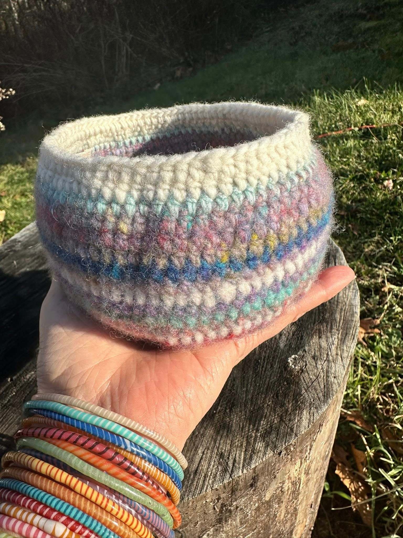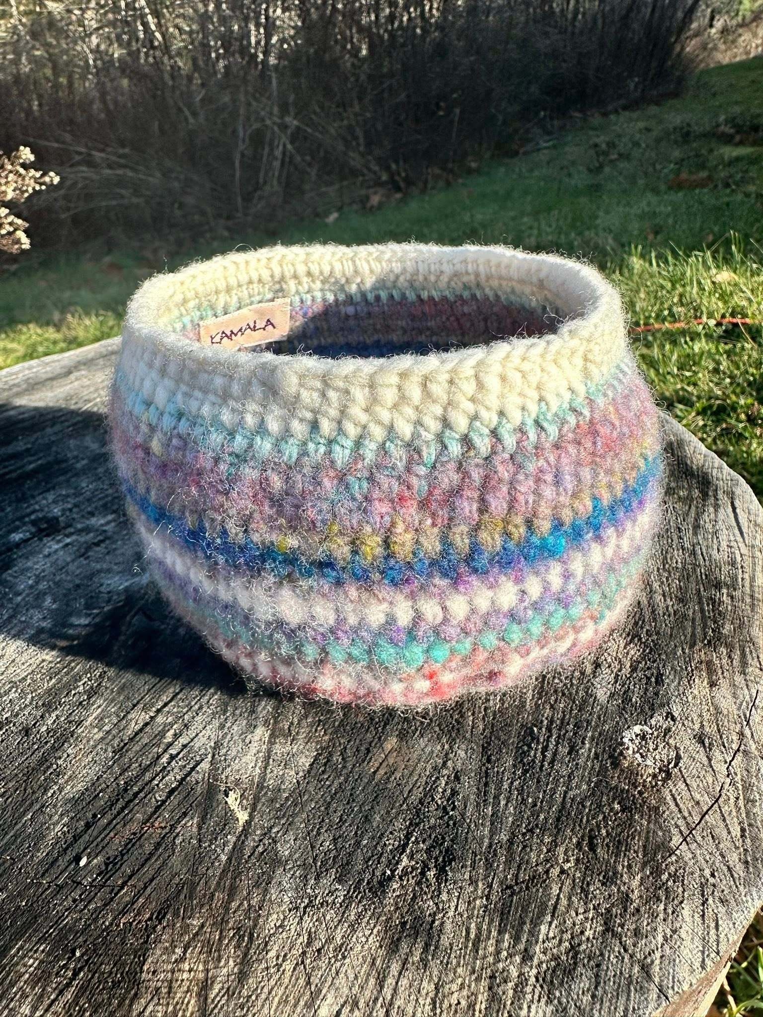 KATE'S ONE OF A KIND HAND CROCHETED OR KNITTED WOOL VESSELS.