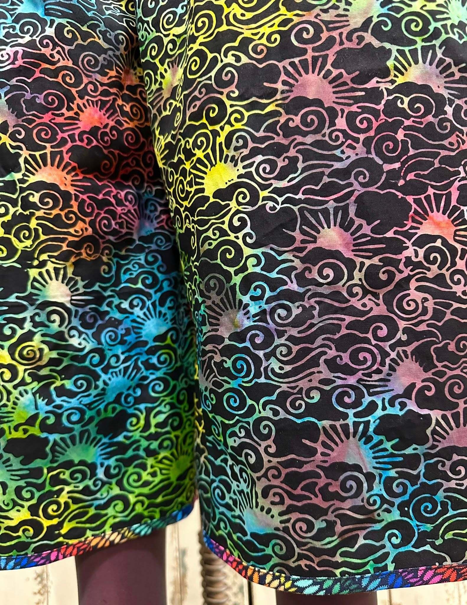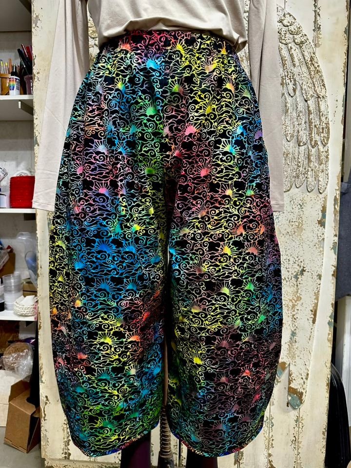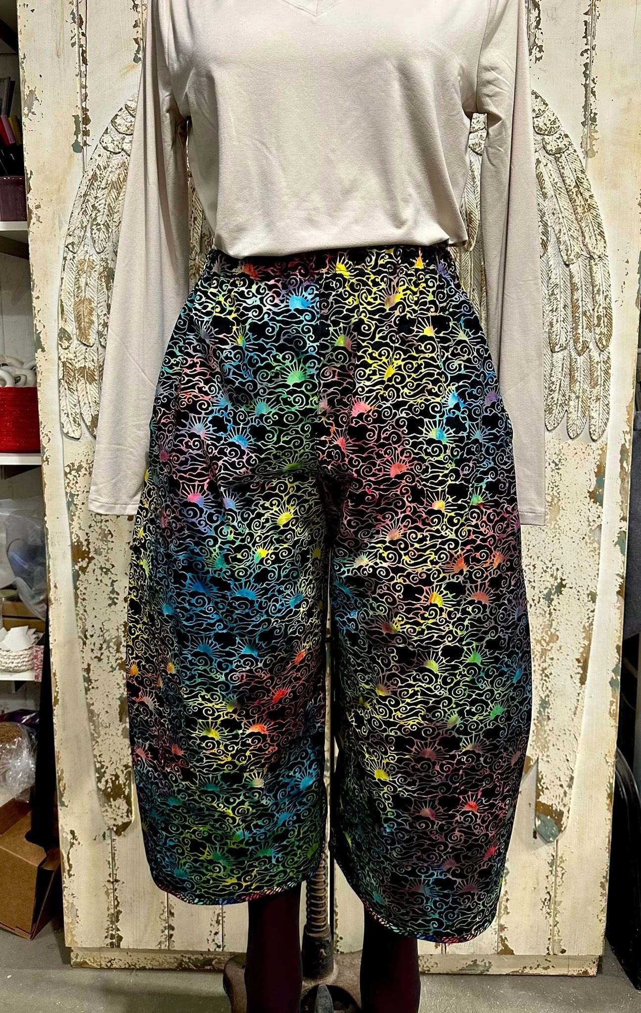 THE ALMOST FAMOUS CROPPED WIDE LEG JESSE PANT IN A WHIMSICAL COTTON BATIK THAT REMINDS ME OF SUNSETS