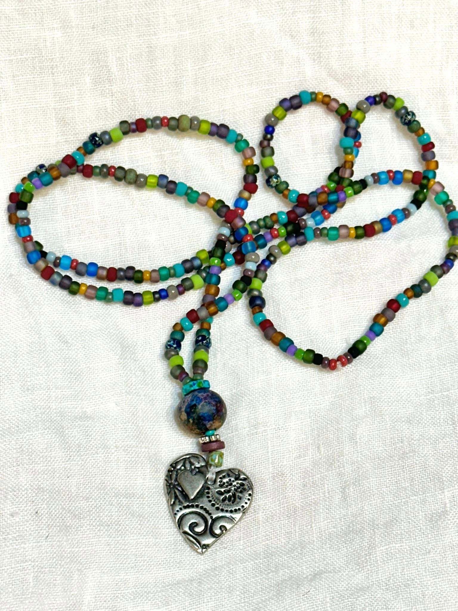 CREATED BY KATE DURING THE JANUARY COLD SPELL WHEN IT WAS TOO COLD IN THE SHOP, A COLORFUL LONG BEADED NECKLACE TO SLIP ON OVER YOUR HEAD.