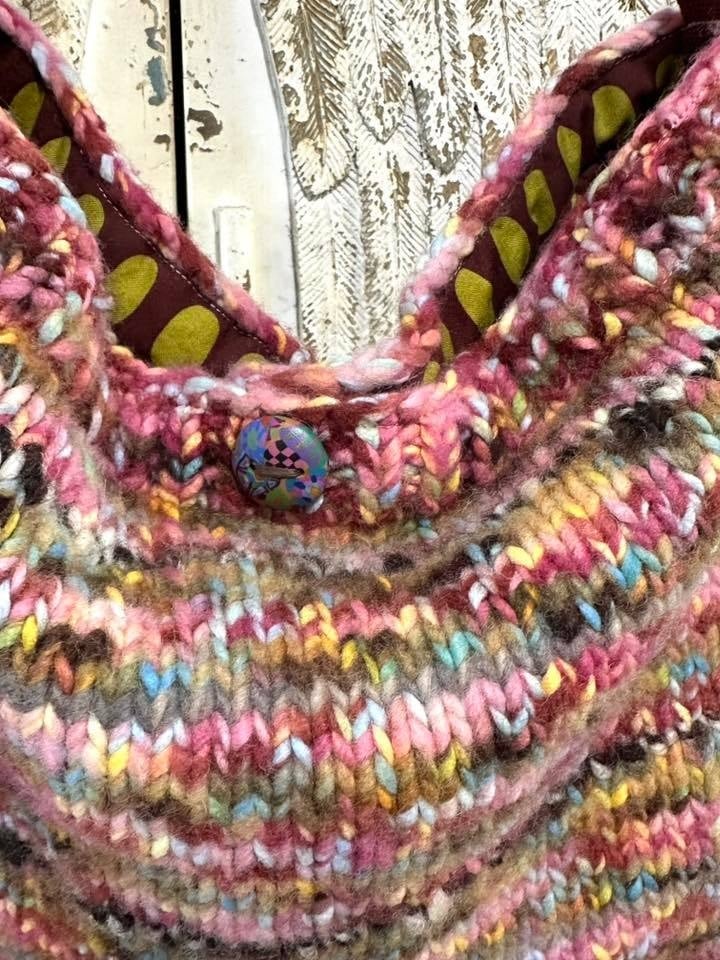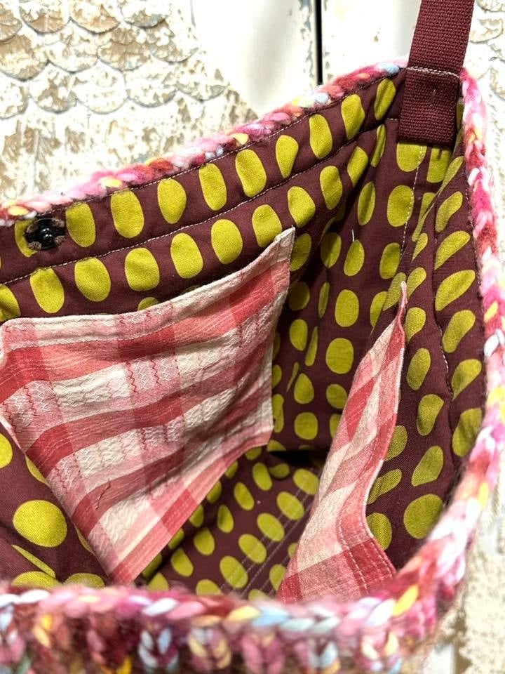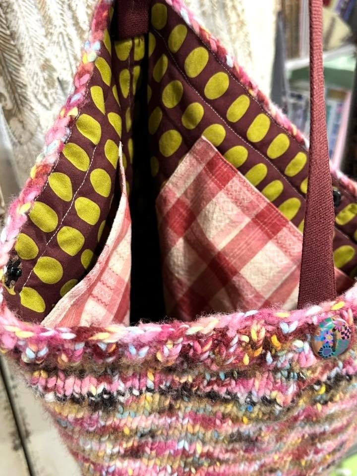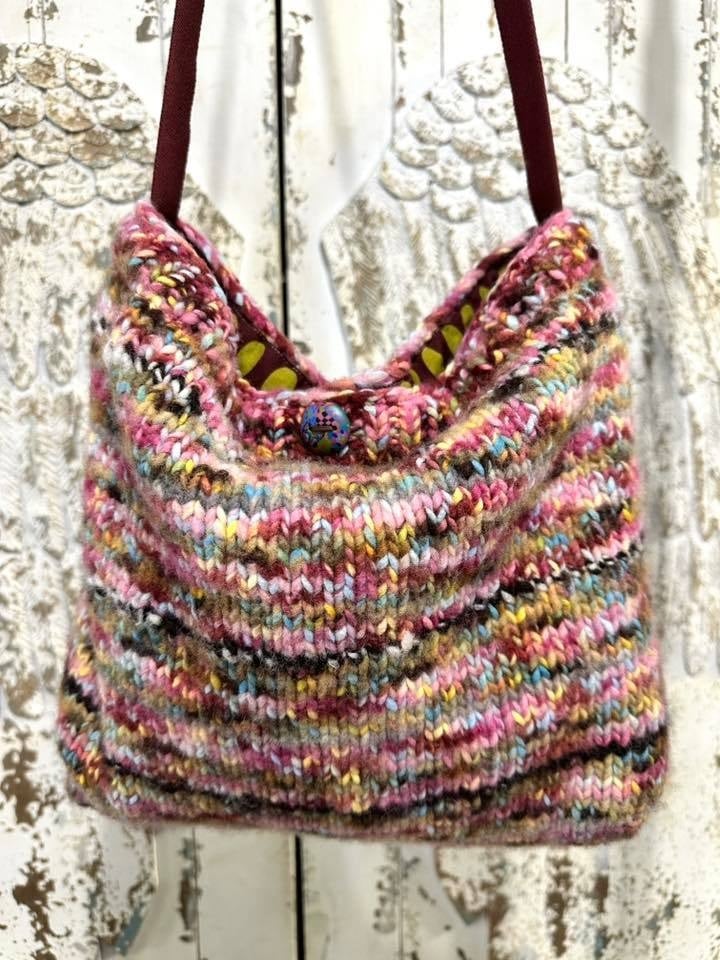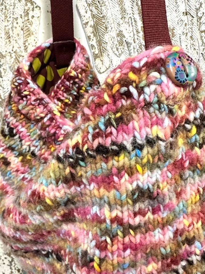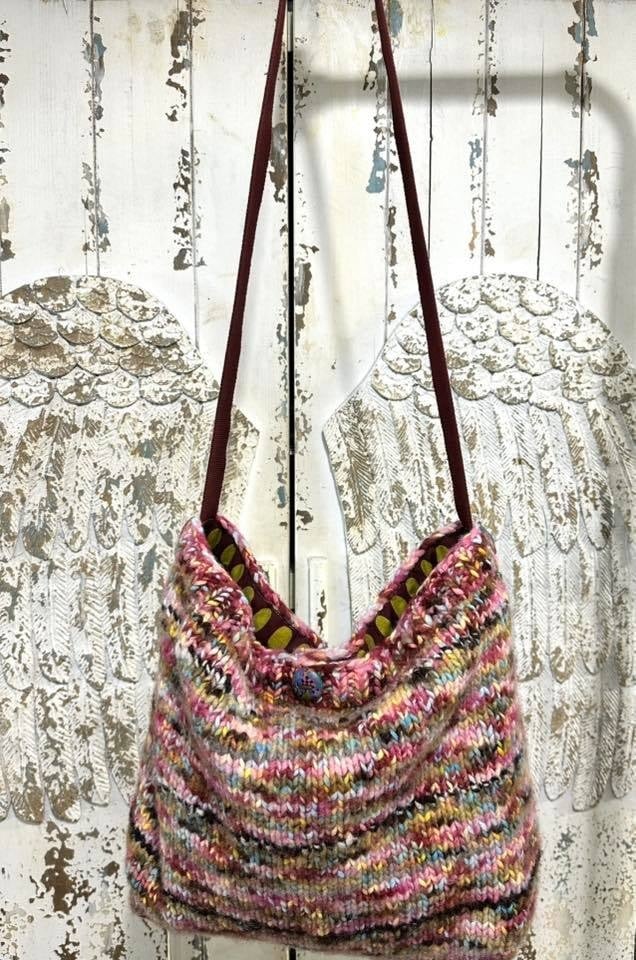 KATE KNIT THIS ONE OF A KIND SOFT SHOULDER BAG FROM THICK YARNS (ON SKINNY NEEDLES!) TO CREATE A UNIQUE FABRIC. THEN SHE FELTED THE BAG AND LINED IT IN CONTRAST PRINTS AND PLAID.