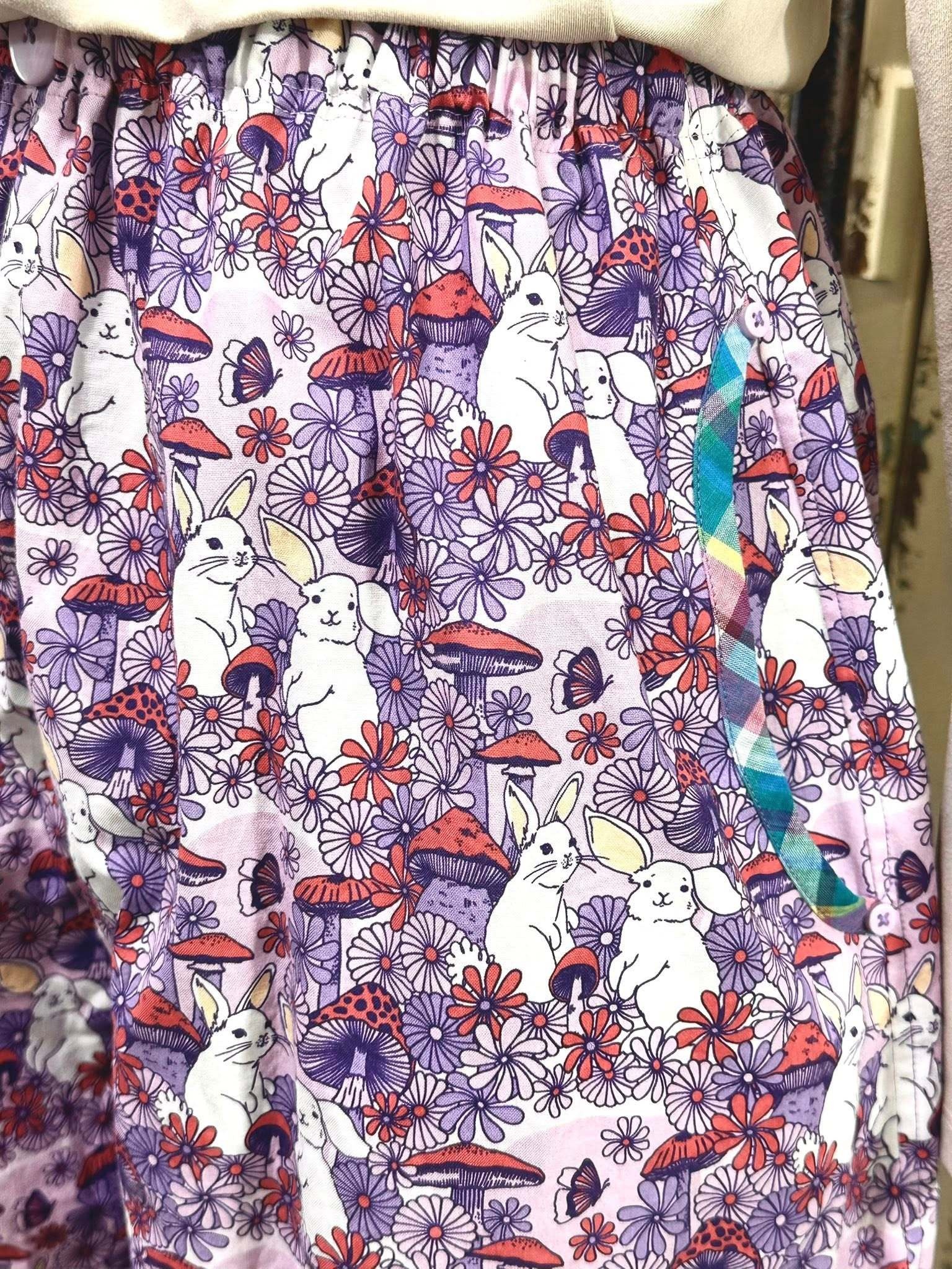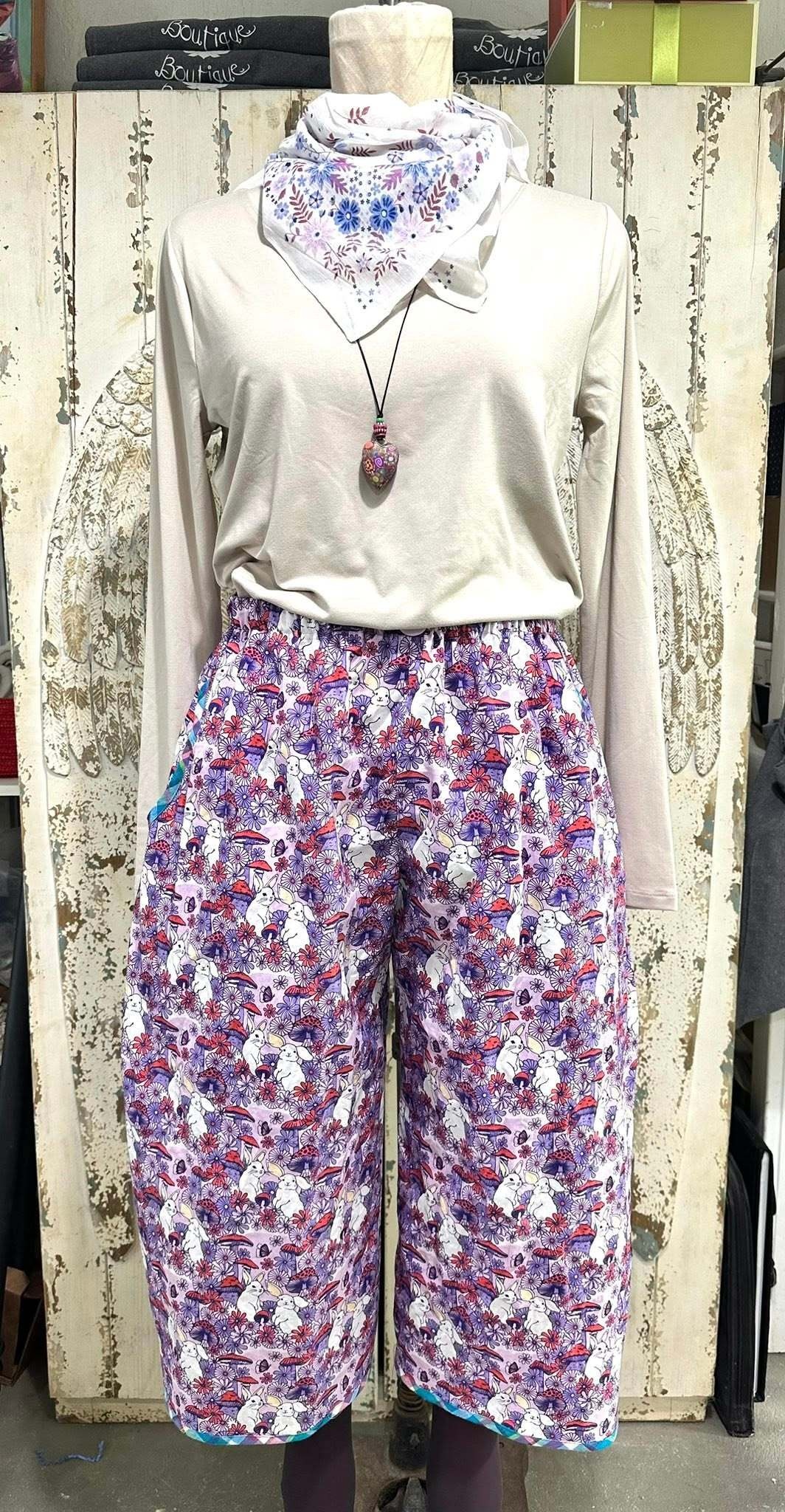 THE ALMOST FAMOUS CROPPED WIDE LEG JESSE PANT IN ADORABLE RABBITS AND MUSHROOMS.