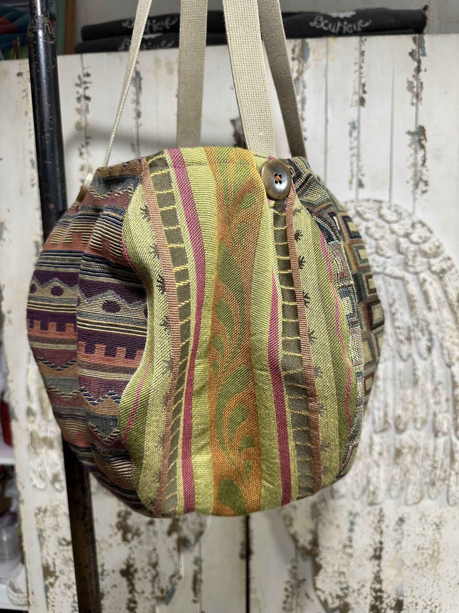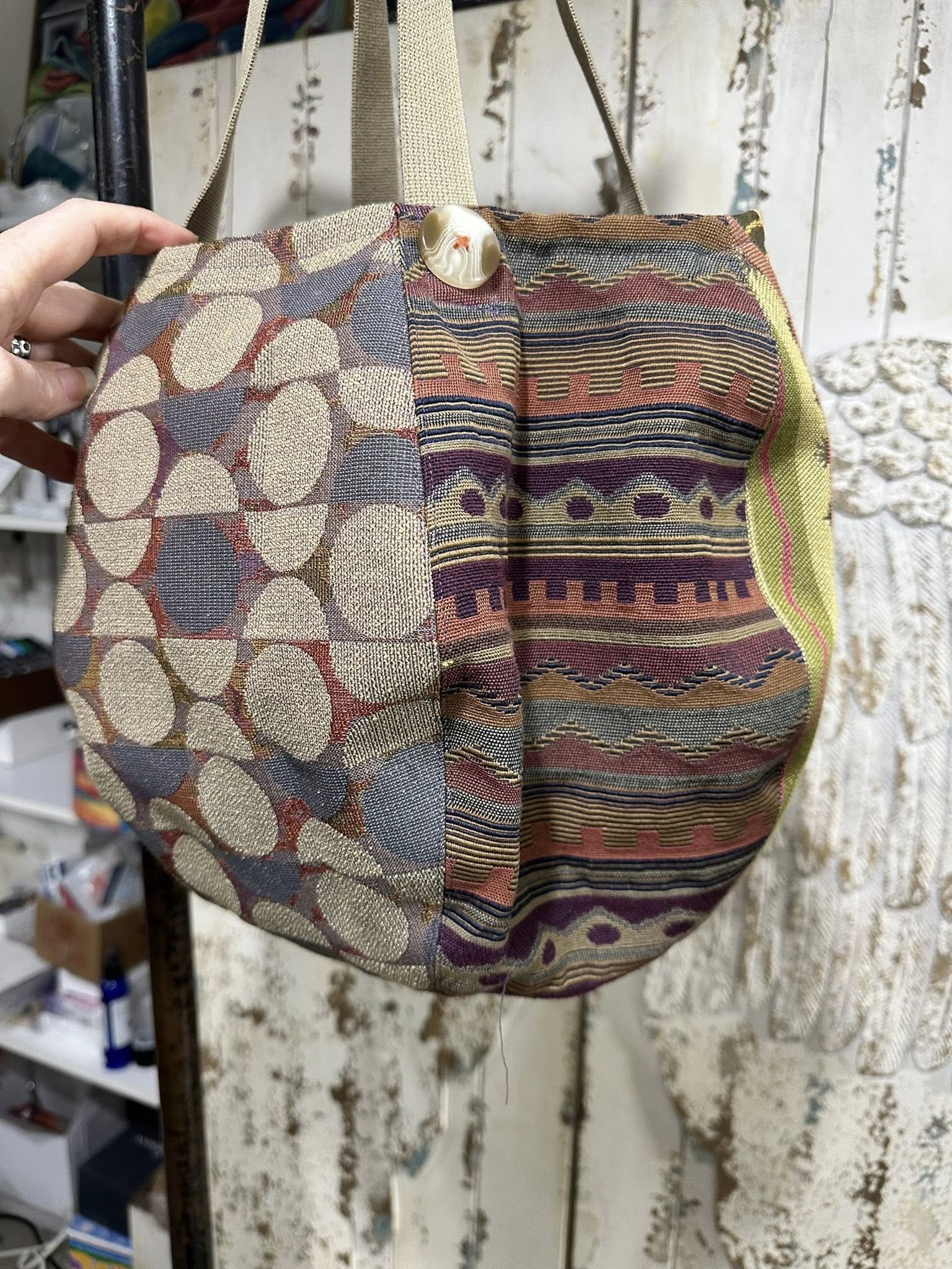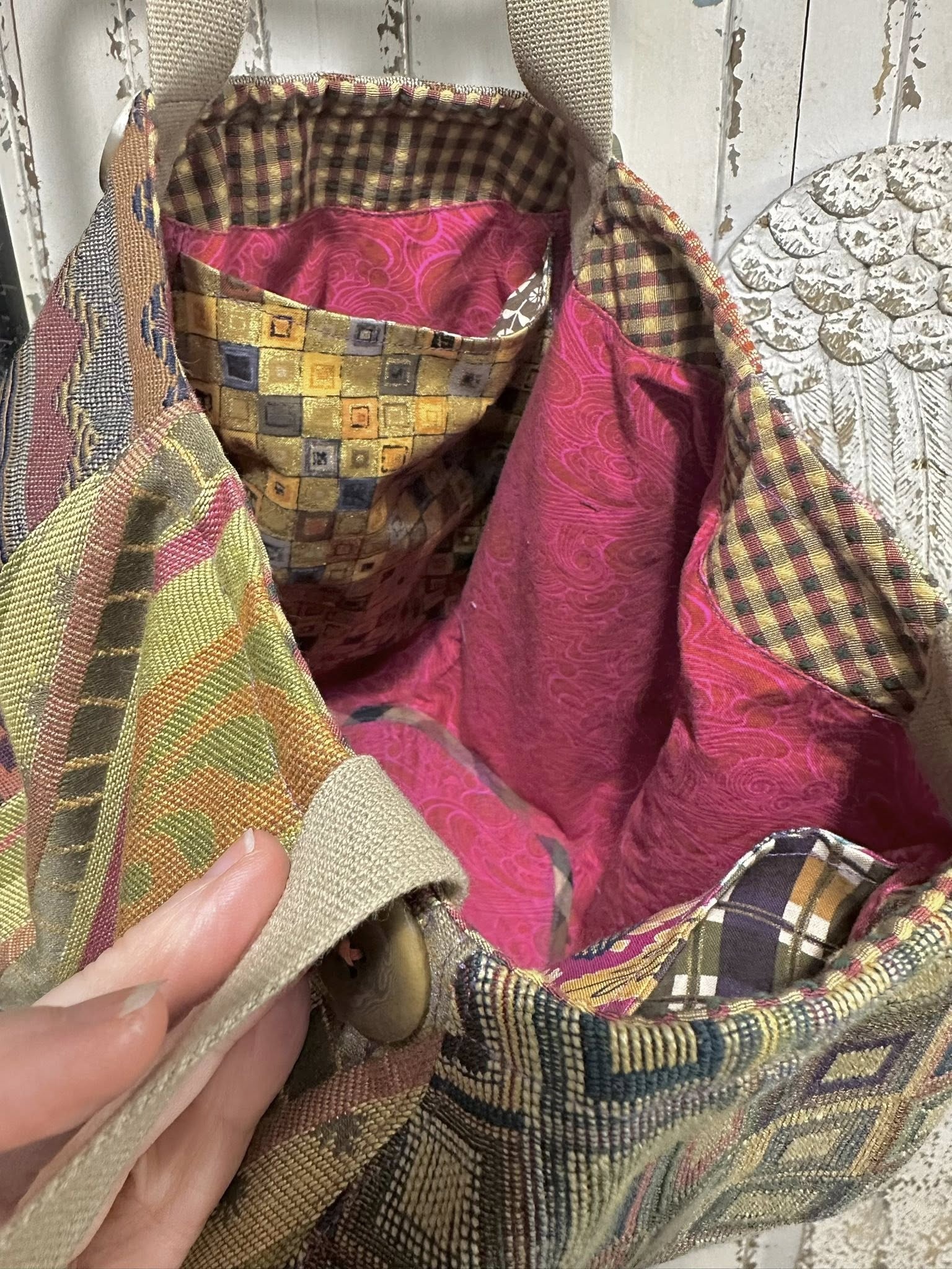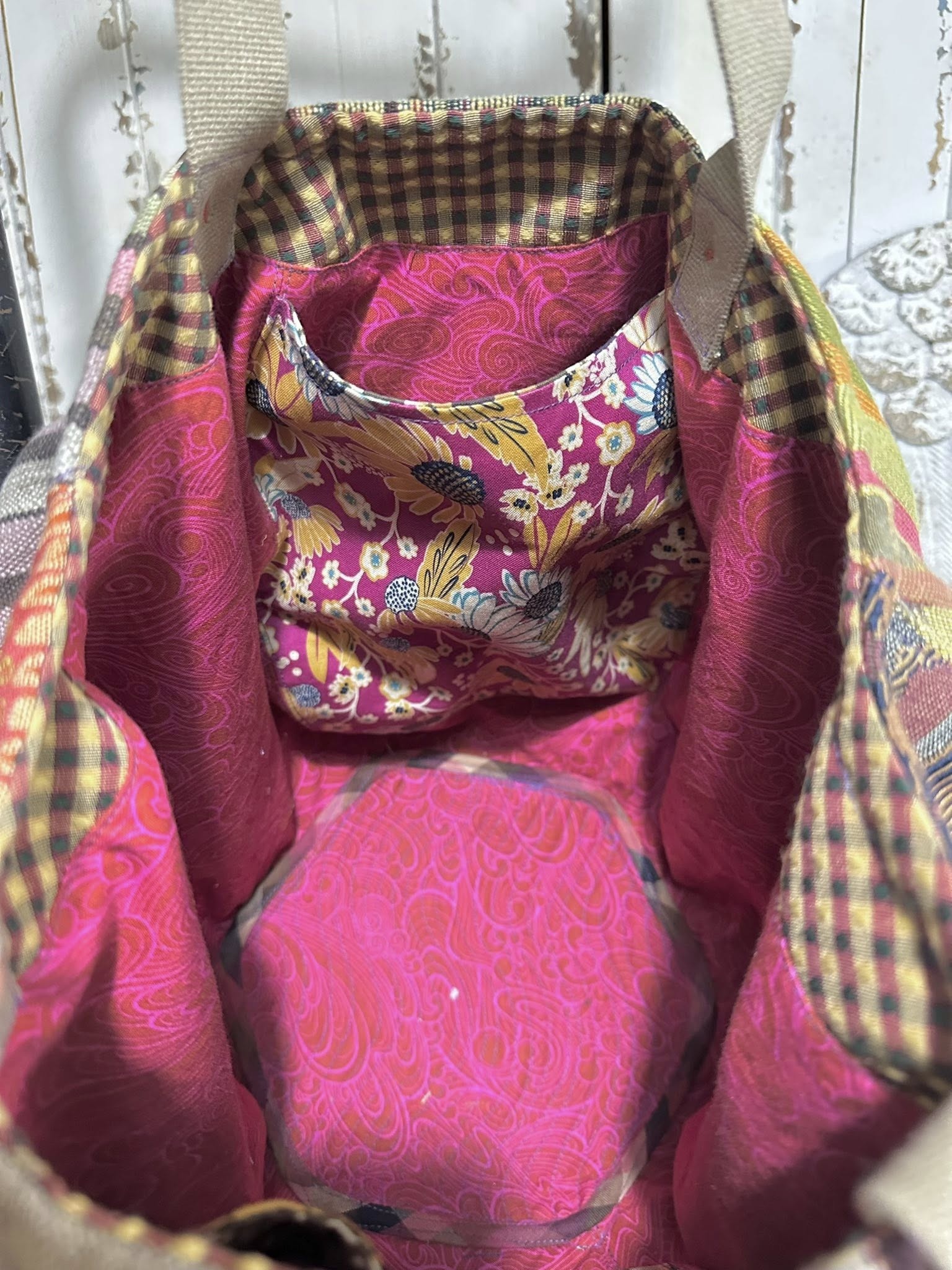THIS FUN GIRL HAS SEVEN DIFFERENT TAPESTRY FABRICS ON THE OUTSIDE, AND FIVE DIFFERENT COTTON PRINTS INSIDE FOR LINING/POCKETS.