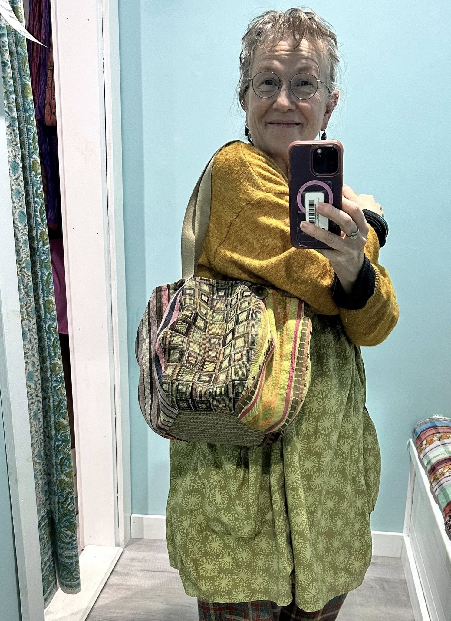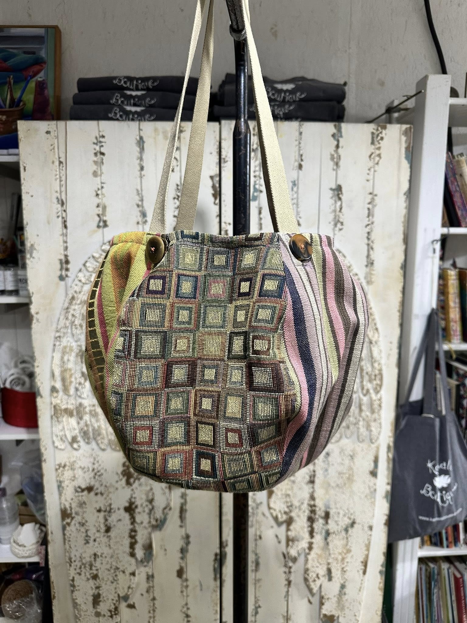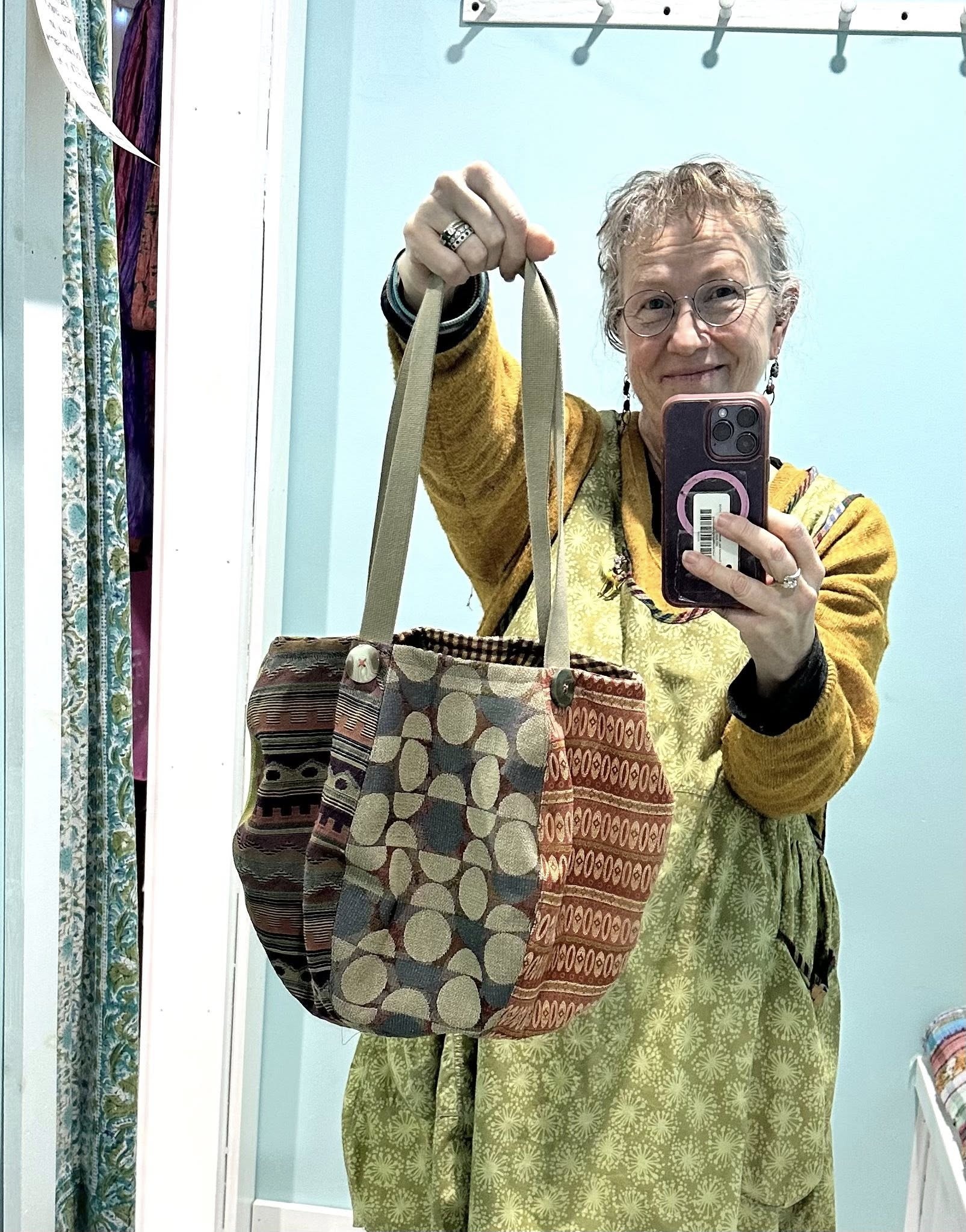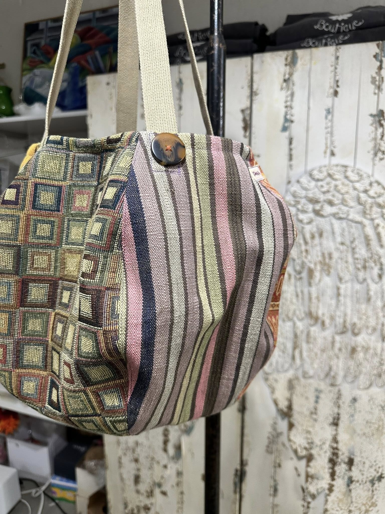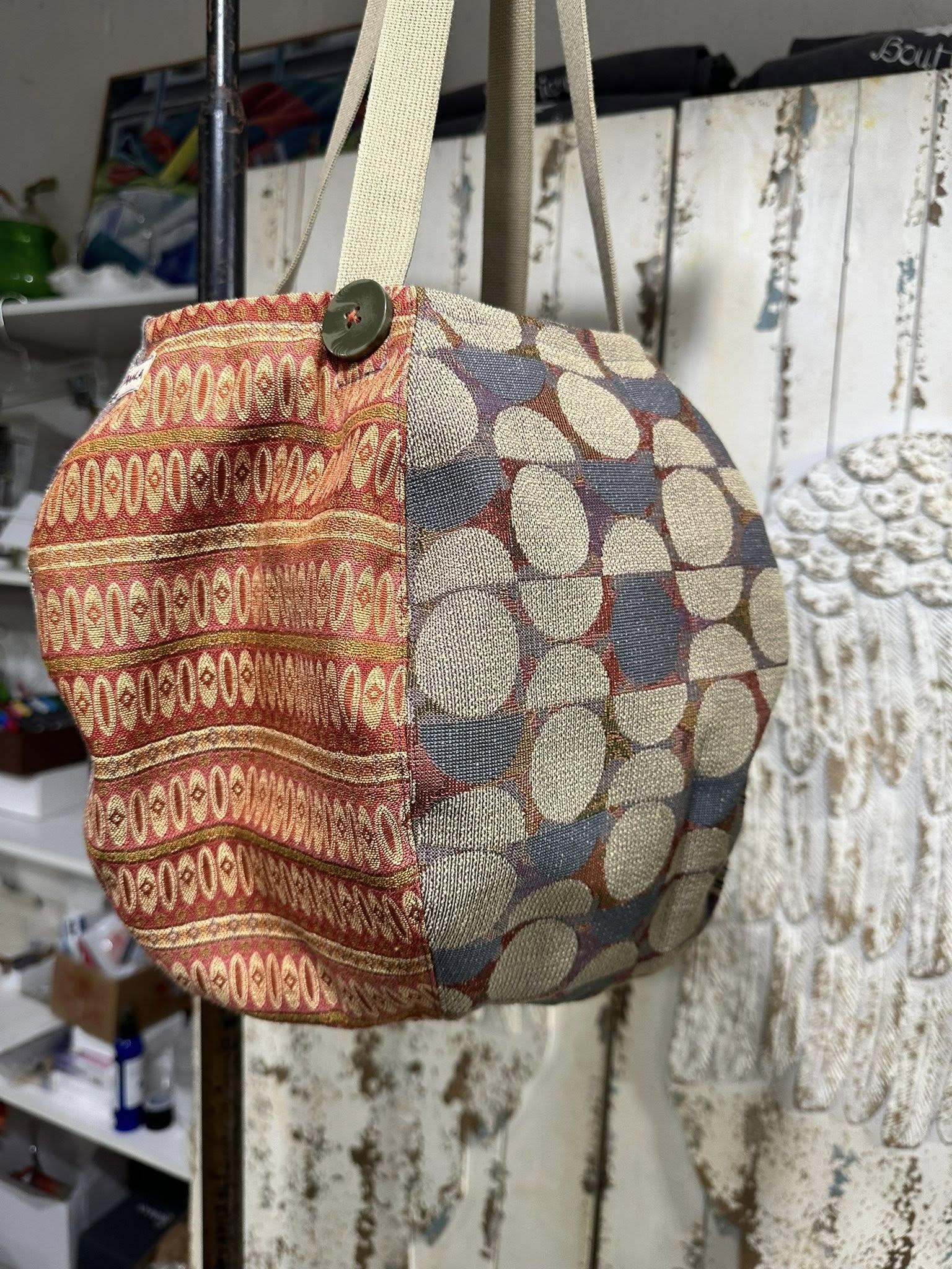 THIS FUN GIRL HAS SEVEN DIFFERENT TAPESTRY FABRICS ON THE OUTSIDE, AND FIVE DIFFERENT COTTON PRINTS INSIDE FOR LINING/POCKETS.
