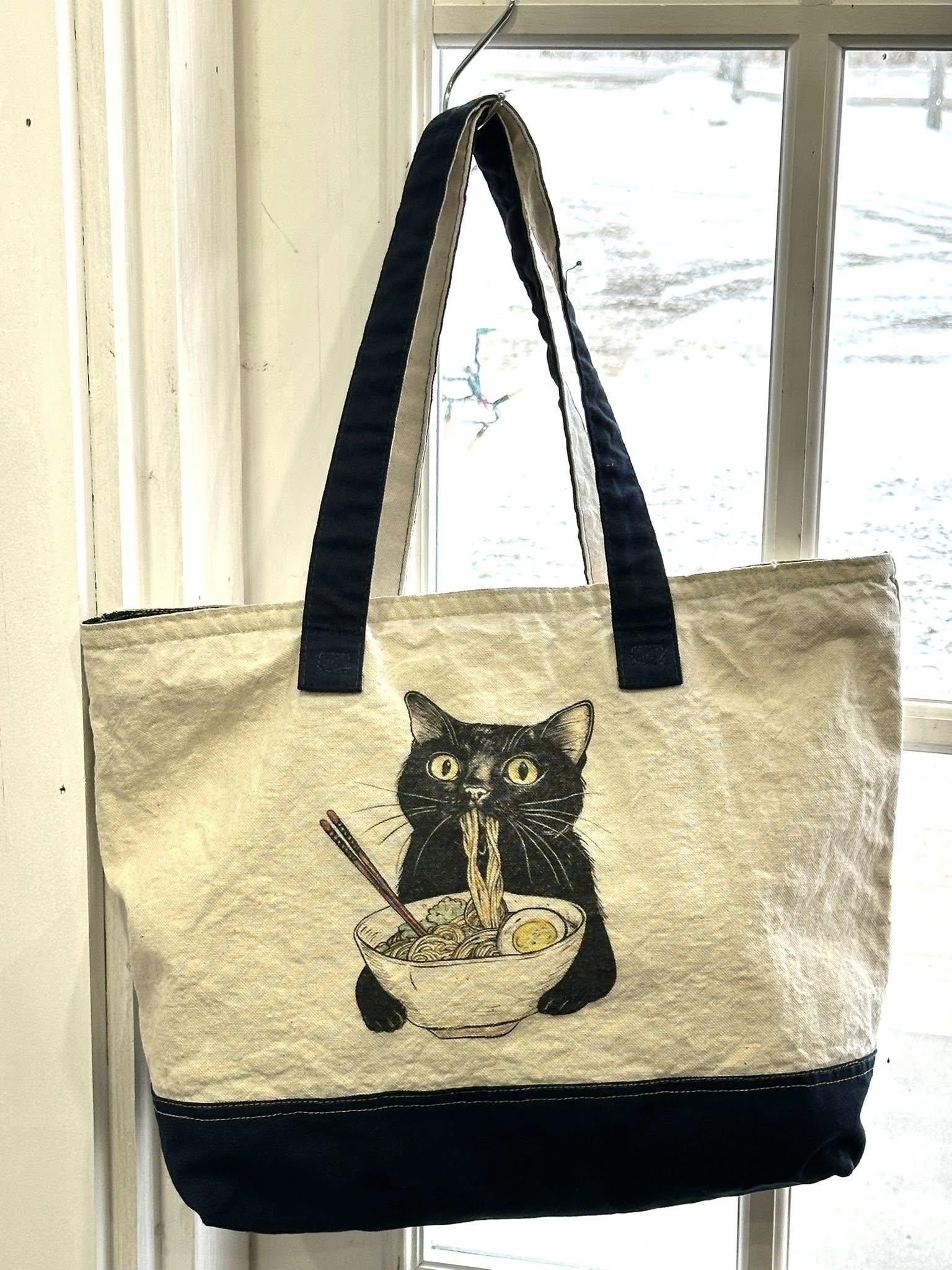 BROKEN IN COTTON CANVAS TOTE WITH ADORABLE RAMEN NOODLE CAT