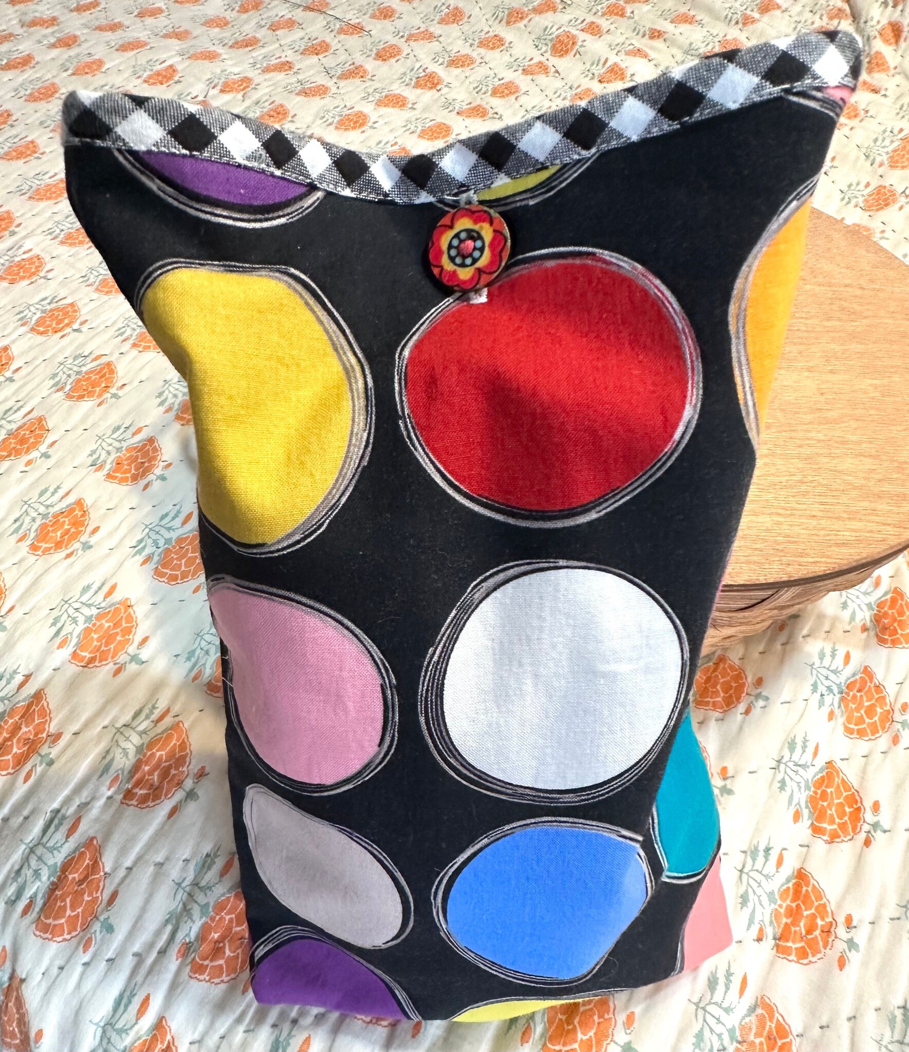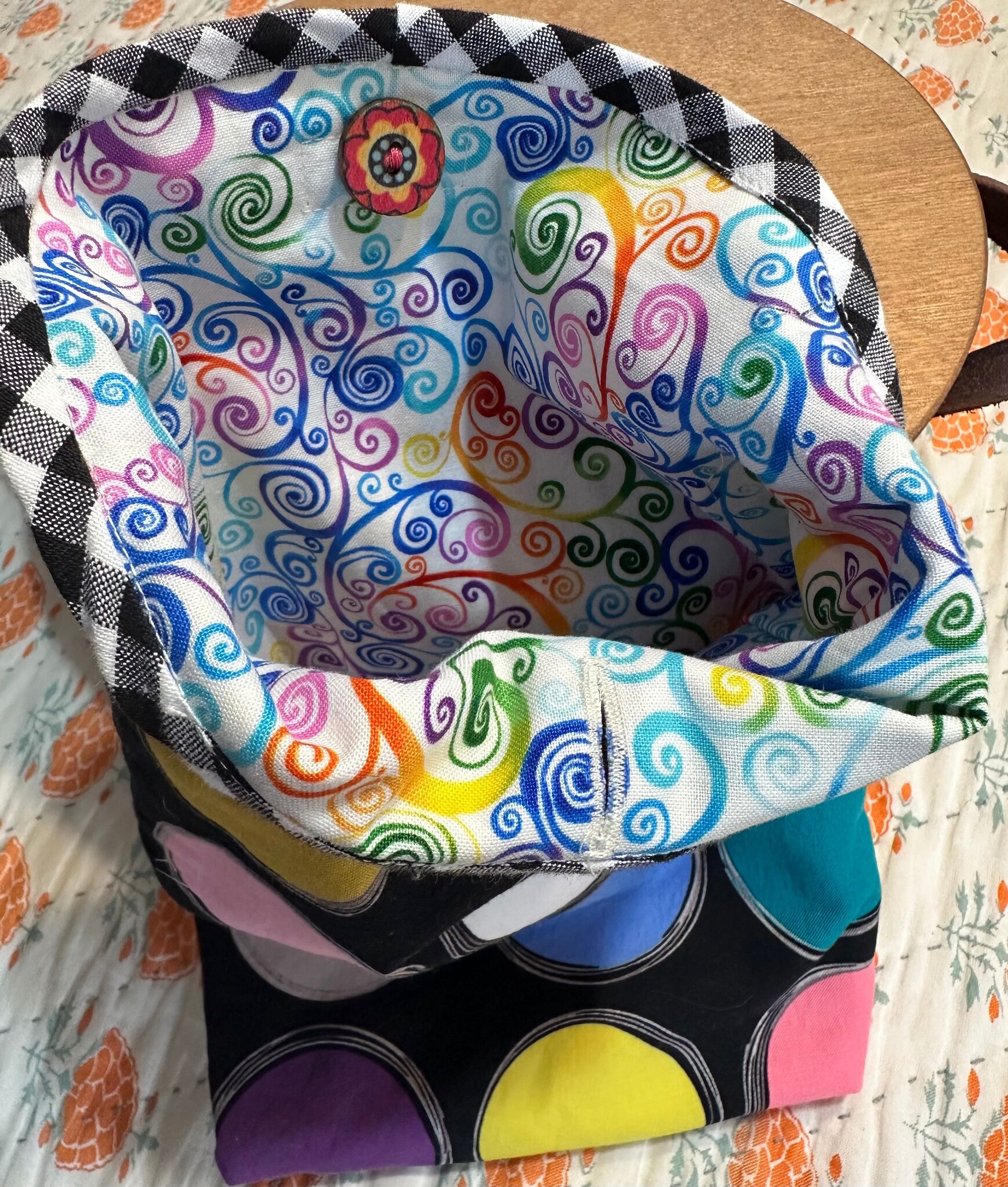 This design is a Very Useful Little Bag, or maybe better... Pocket, about 8"X 11.5" with a button closure at the top. The fabrics are beautiful cottons, lined with something pretty to complement. And then there is that fun trim at the top!