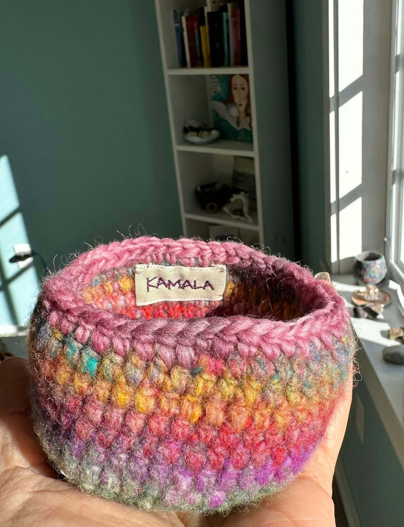 This offering is a colorful crocheted bowl, softly felted to create a dense container to keep on your desk or nightstand.